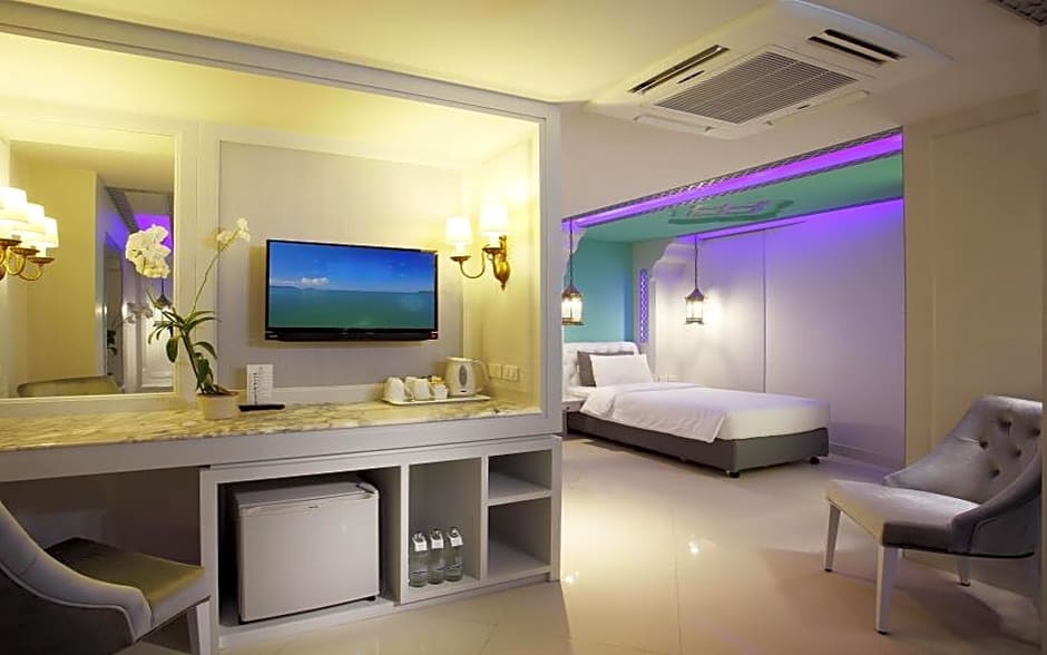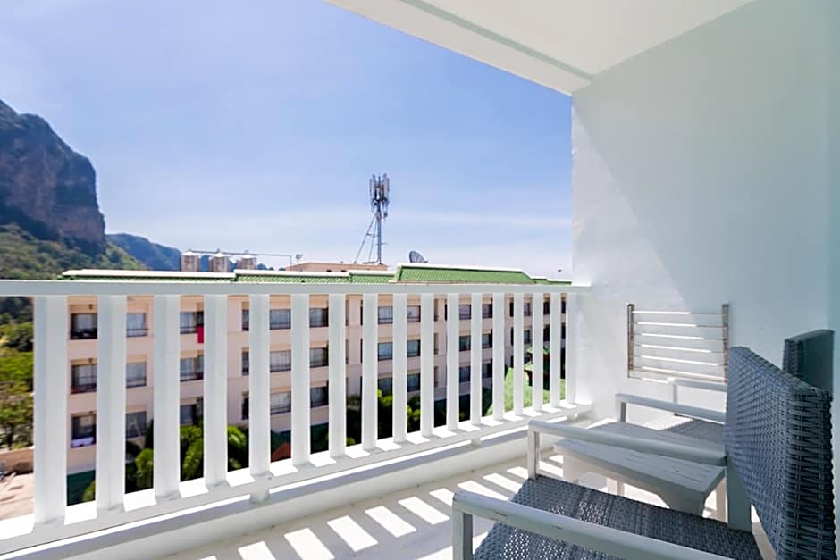 This family room features ceiling patterns, low hanging lampshades and a sofa. The cozy private balcony provides partial views of the Andaman sea. A flat-screen TV is included.